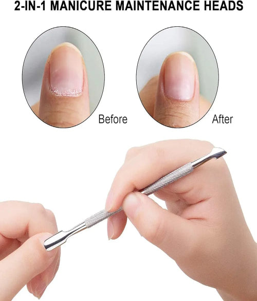 The Cuticle Pusher and Cutter with Storage Case is a professional nail care tool designed for clean, precise, and easy manicures. Made from high-quality stainless steel, it features a dual-ended design with a smooth cuticle pusher on one side and a sharp, safe cuticle cutter on the other. This tool helps gently push back cuticles, remove dead skin, and prepare nails perfectly for nail polish application. Its ergonomic handle offers a comfortable grip, ensuring better control and accuracy during use. Rust-resistant and easy to sanitize, it is suitable for both home use and professional salons. The included storage case keeps the tool protected, hygienic, and travel-friendly. Ideal for manicures, pedicures, and nail art prep, this durable tool supports healthy, neat-looking nails. Achieve salon-quality results anytime with this reliable cuticle care essential that combines convenience, precision, and long-lasting performance for beautiful nails every day π β¨π§ΌπΈπ